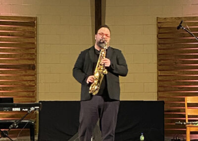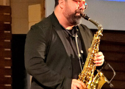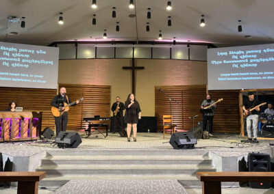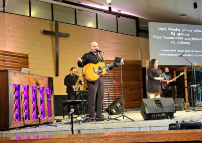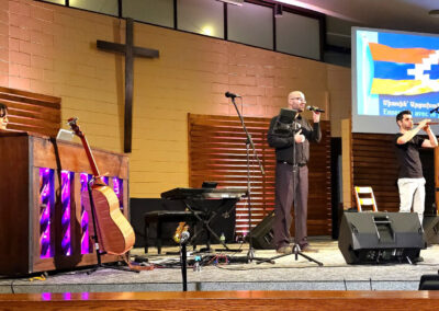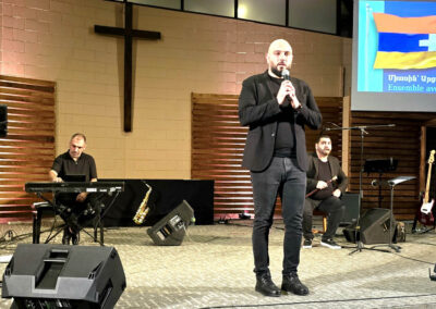 The evening proceeded with the incredible performance of Krikor Oskerijian, who sang the Armenian classic songs “Groung Kna” and “Giligia”. He was later joined on stage, by the famous saxophonist Mr. Karno Simonian. He delighted the listeners with his amazing piece “Im Siro Hasak” and the renowned “Kedashen”. The talented FAEC Worship band then took the stage and captivated the audience with the song “Khachin Zinvor”, as well as the Armenian version of the worship song “Blessing”. Afterwards, Ms. Shoushanik Melkonian recited the poem “Menk”, while the crowd listened in awed silence. Elie Berberian concluded the performance segment of the evening with his spellbinding rendition of “Hayer Miatsek,” emphasizing what Mr. Viktor Karapetyan mentioned in his speech, regarding the importance of Armenians, uniting and collaborating together.
