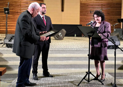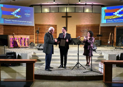 Mrs. Salpi Nercessian ended the evening with her closing remarks, profoundly thanking all the performers, volunteers, sponsors and attendees. She invited Mr. Hagop Basmadjian, AMAC founding member and longtime supporter of Artsakh, to present a Certificate of Appreciation and a Canada gift to Mr. Viktor Karapetyan, thanking him for his sacrificial service and dedication.